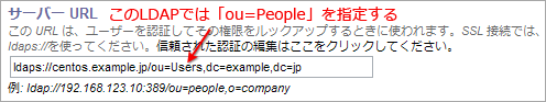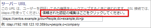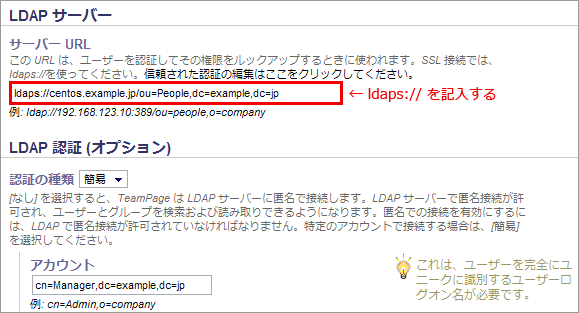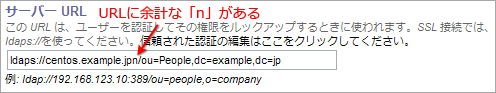次に、「サーバー URL」欄で指定する LDAP サーバーのアドレスを ldap:// から ldaps:// に変更します。ポート番号を省略した場合は自動的に 636 番が使用されます。