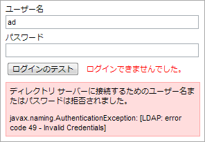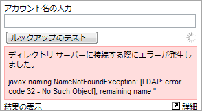 LDAP サーバーに認証情報を問い合わせるユーザー(LDAP の管理者アカウント)の設定に誤りがあると、次のようなエラーが表示されます。