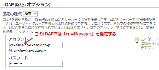 例えば、この例では、本来「cn=Manager」を指定すべきところを誤って「cn=admin」としていました。ここを訂正します。