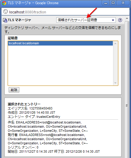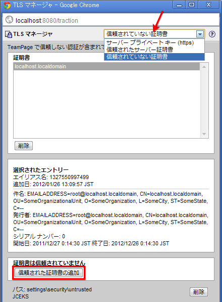 これで TeamPage が証明書を信頼するようになりました。ドロップダウンリストで [信頼されたサーバー証明書] をクリックして確認できます。