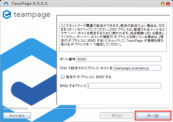 「DNS で規定されたアドレス/ホスト名」には、他のホストから TeamPage がインストールされたホストにアクセスするためのアドレスを入力します。多くの場合、DNS で規定された完全修飾 URL か IP アドレスです。