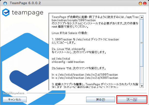 コンピューターが(Linux が)起動したときに自動的に TeamPage も起動させる方法についての説明が表示されます。