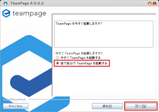 インストールが問題なく完了しているかどうかを確認するため、ここでは [後で自分で TeamPage を起動する] オプションを選択して [次へ] をクリックします。