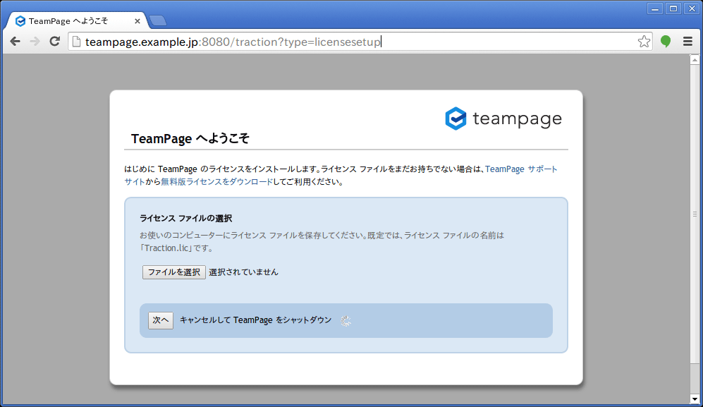 下図のライセンスのインストール画面が表示されれば、TeamPage へのアクセスは成功です。