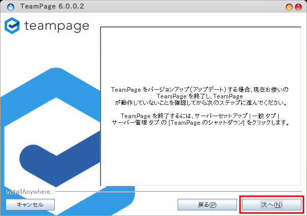 インストール済みの TeamPage をアップデートする場合は、インストールを進める前にその TeamPage を停止(シャットダウン)するよう、下図の注意が表示されます。TeamPage が停止していることを確認したら、[次へ] ボタンをクリックして先へ進みます。