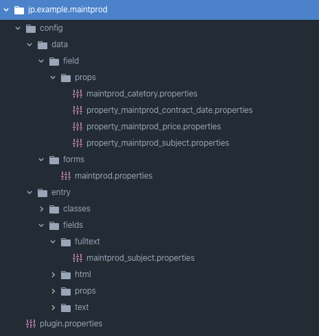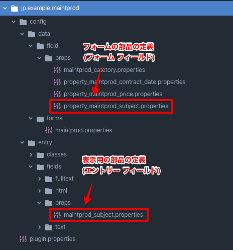 フォームの部品の定義ファイルは、config/data/field/props部品名.properties という名前で保存します。