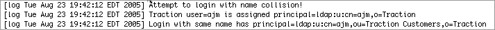 例えば、ログに次の記録が見つかった場合、LDA P中の別のユーザーが同じ CN を使っていることがわかります。TeamPage は、TeamPage のユーザーアカウント名を検索するときに既定で CN を使います。(上述の「X.509 クライアント認証検索式」を参照)