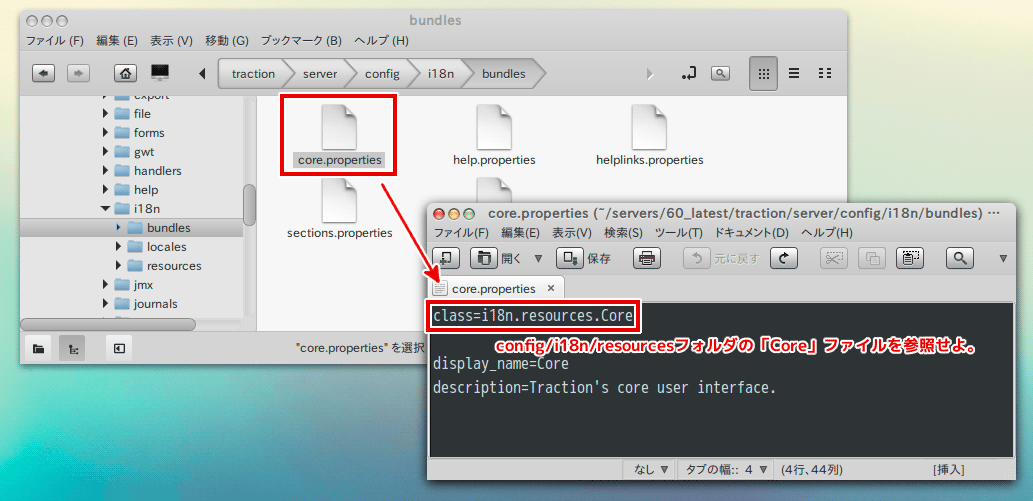と書かれています。これは「config/i18n/reources フォルダにある Core ファイルを参照せよ」という意味です。ロケール(言語)に応じて、ロケールが日本語(ja)の場合は Core_ja.* ファイルが、ロケールが英語(en)の場合は Core_en.* ファイルが参照されます。