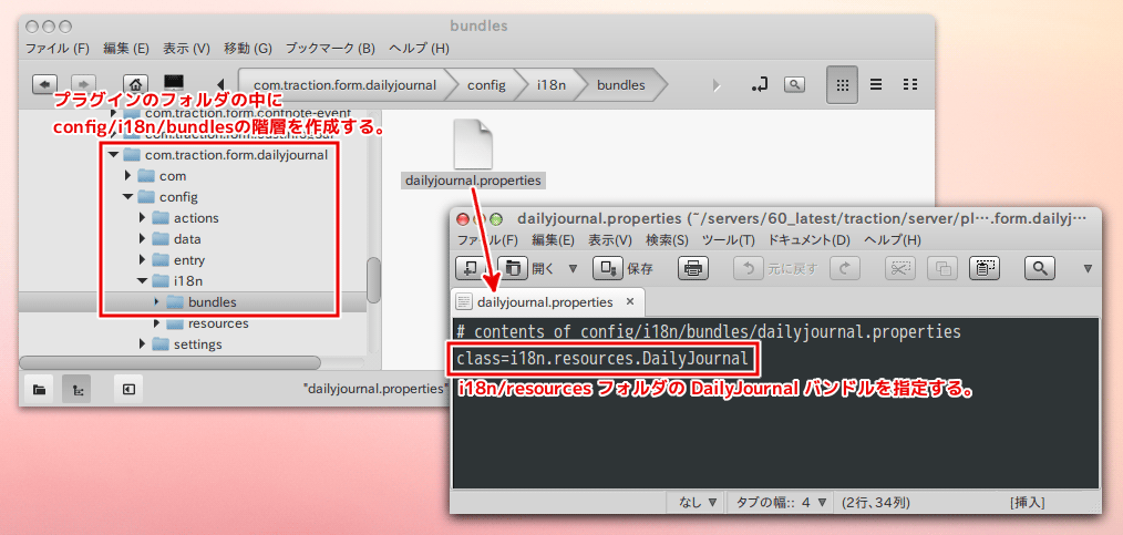 server ディレクトリの下の plugins フォルダの中にプラグインのフォルダ「com.traction.form.dailyjournal」の中の、config/i18n/bundles というフォルダ階層にバンドル定義ファイルである dailyjournal.properties を作成してテキストエディタで開き、次のように記述し、保存します。