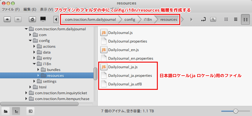 プラグイン フォルダの中に config/i18n/resources というフォルダ階層を作成します。その中に DailyJournal のリソースファイルを設置します。