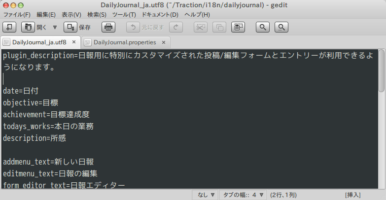 まずは DailyJournal_ja.utf8 をテキスト エディタで作成します。文字エンコードは UTF-8 にする必要があります。