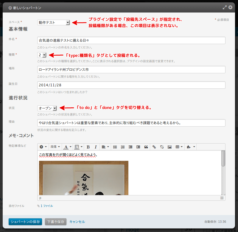 新しい投稿/編集フォームの作り方を紹介するためのフォーム例と、そのフォームによって投稿されるエントリー例「シェパートン」と、その他関連ファイルの組み合わせです。