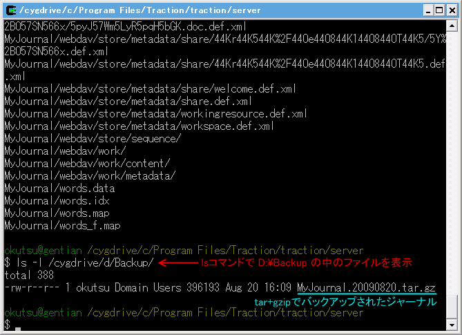 ここでは、C:\Program Files\Traction\traction\server を D:\Backup にバックアップするものとします。Windows の D: ドライブのパスは、cygwin では /cygdrive/d になります。