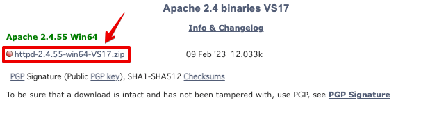 https://www.apachelounge.com/download/ から Windows 版 Apache をダウンロードします。