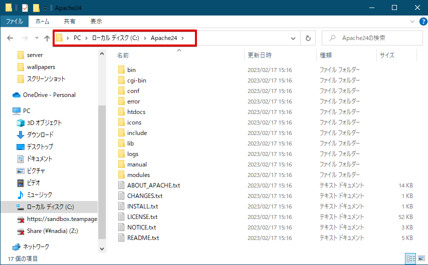 ダウンロードした httpd-2.4.55-win64-VS17.zip を展開し、中にある「Apache24」フォルダを適当なフォルダに設置します。
