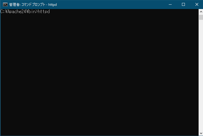 管理者モードのコマンドプロンプトを起動し、「C:\Apache24\bin」に移動し、「httpd」と入力して Enter キーを押すと Apache サーバーが起動します。画面は、下図のように「httpd」で止まったような状態になりますが、Apache は動作し続けています。(終了するには Ctrl + C キーを押します)