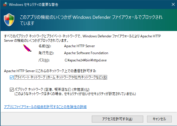 下図のようなファイアウォールの警告が表示されることがあります。その場合はアクセスを許可してください。