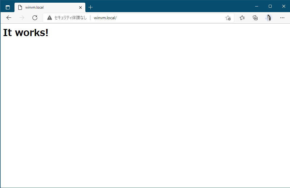 ブラウザーで http://winvm.local/ にアクセスし、下図のように「It works!」が表示されます。これは Apache の素っ気ない初期画面で、Apache が動作していることを意味しています。