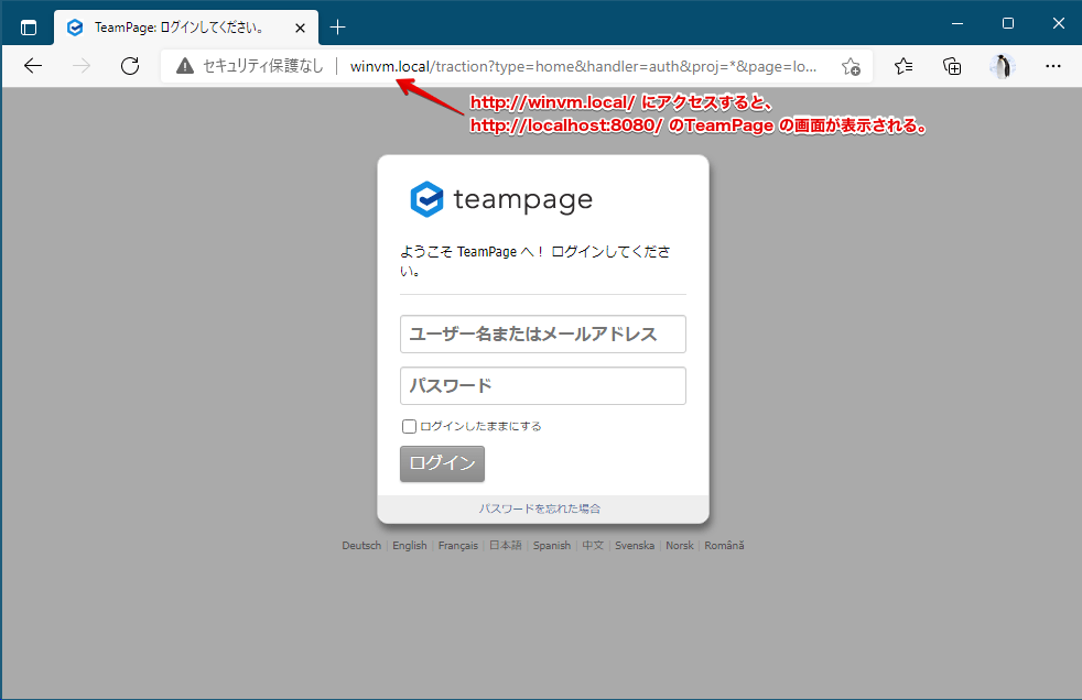ブラウザーで http://winvm.local/ にアクセスすると、先ほどの「It works!」の代わりに今度は TeamPage の画面が表示されます。