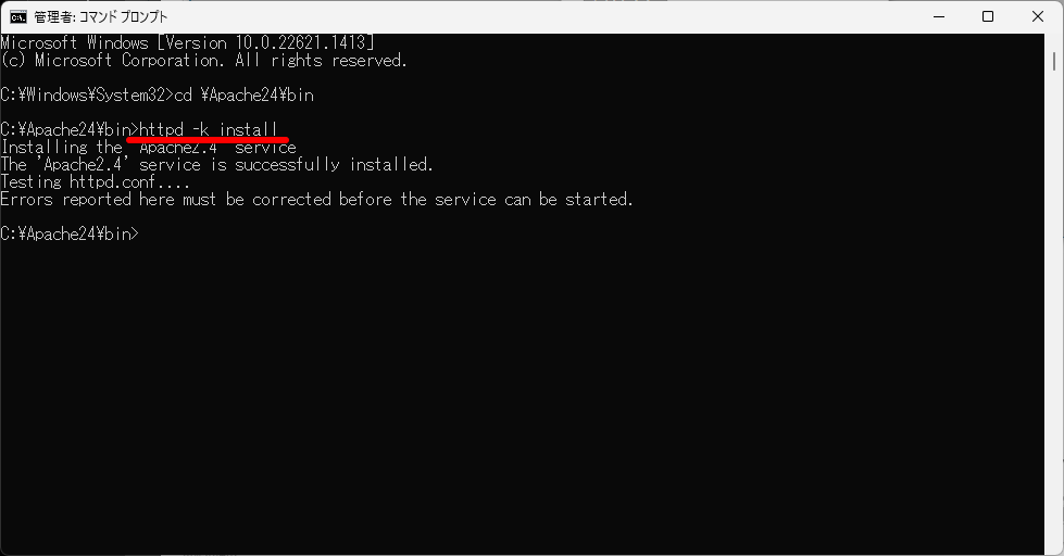 コマンドプロンプト上の「httpd」を停止し(Ctrl + C キーを押す)、コマンドプロンプトで C:\Apache24\bin へ移動し、-k instal