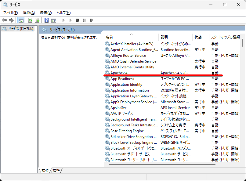 Windows のサービス一覧を開いて「Apache 2.4」が登録されていることを確認します。
